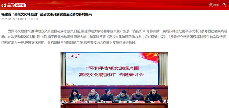 1月27日,中华网报道福建师范大学协和学院文化产业系“古韵新声,吉春共赋”实践队师生赴南平邵武市开展寒假社会实践活动。