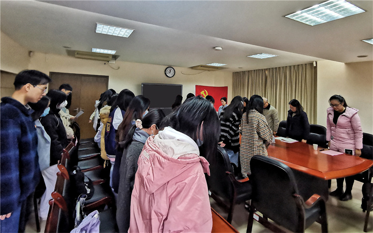 当天是第八个南京大屠杀死难者国家公祭日。支部大会开始前,全体党员同志为死难者默哀。