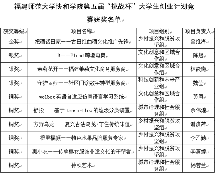 3月13日,由共青团福建师范大学协和学院委员会主办的福建师范大学协和学院第五届“挑战杯”大学生创业计划竞赛决赛在学术报告厅举行。本次竞赛评委团由五位福建省优秀创业导师、企业家组成。最终“把酒话田家——古田红曲酒文化推广先锋”团队以它新颖的创意想法与出色的路演斩获金奖。