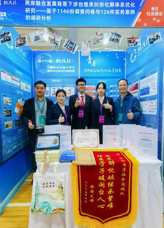 在主体赛中,学院经济与法学系报送的《两岸融合发展背景下涉台继承纠纷化解体系优化研究——基于1146份调查问卷与126件实务案例的调研分析》项目脱颖而出,荣获全国二等奖。该项目由翁怡、李杰锋、王伟强三位老师指导,许灵旭、沈晓渝、吴奕希、姜琪、鲍玺、宋丹琳、李以欣、胡嘉琦8名学生共同完成。项目聚焦两岸融合发展中的法律实务问题,通过大量实证调研,提出了具有创新性的解决方案,展现了学院学子扎实的专业素养和强烈的社会责任感。