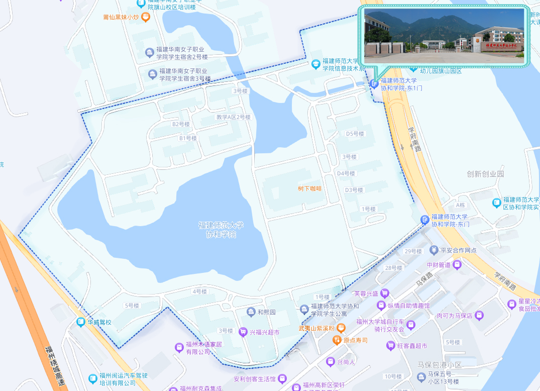 (百度导航“福建师范大学协和学院东1门”、高德导航“福建师范大学协和学院东北门”)
