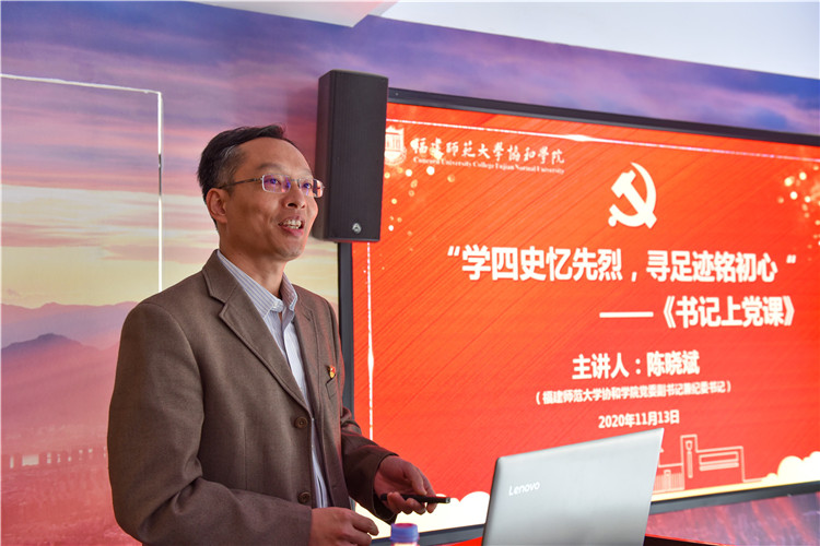 2020年11月13日,时任学院党委副书记陈晓斌以《学四史忆先烈,寻足迹铭初心》为题,为国际商学系师生上思政课。他列举了抗击新冠肺炎疫情中学院师生志愿者无私奉献的先进事迹,指出“协和红”是学生党员共同创造的。他强调要重视“四史”教育,身处福州的大学师生要善用福建特色文化资源,在“四史”学习中坚定理想信念,升华大爱情怀,保持前进姿态,增强担当意识。他希望师生党员通过四史学习,增强担当意识,服务学院,用实际行动共绘“协和红”。