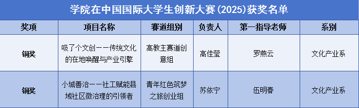 日前,教育部公布中国国际大学生创新大赛(2025)全国总决赛获奖名单,我院在赛事中共摘得2项铜奖,分别是高教主赛道创意组项目《吸了个文创——传统文化的在地唤醒与产业引擎》、青年红色筑梦之旅创业组项目《小城善治——社工赋能县域社区微治理的引领者》。
