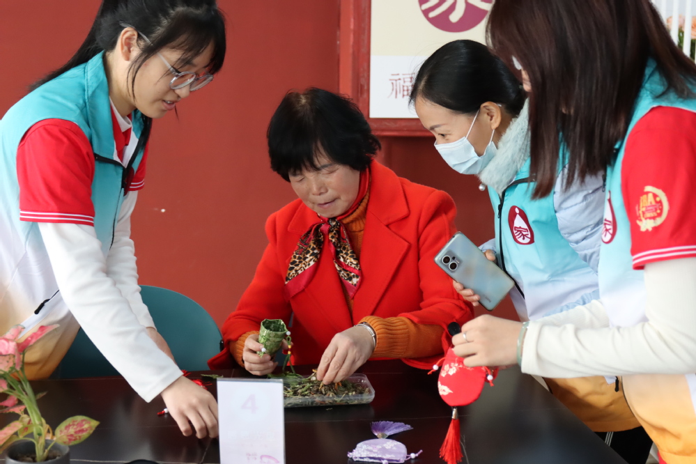 活动伊始,支部成员悉心引领老人落座,倾情朗读雨花家文化、《弟子规》、观看视频,传递正知正念,沐浴孝道文化。支部成员还为老人们表演中华传统舞蹈,感受春日意蕴;演唱红色纪念歌曲,体会社会温情;准备精美素食,恪守优秀礼仪。此外,支部成员为老人们准备了艾叶、薰衣草等中药材和各色丝绸布料,根据老人喜好择选材料,邀请老人们一同制作香囊,用于驱蚊安神,引导老人们感受传统文化的魅力;支部成员展示出初具雏形的竹编和京剧面具,传授编制方法和绘制技巧。