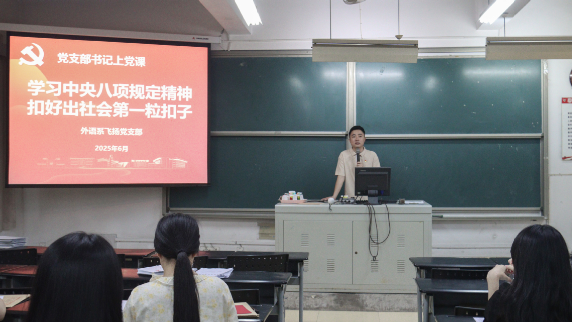 活动中,外语系飞扬党支部书记李宏滨以《学习中央八项规定精神,扣好出社会第一粒扣子》为题,从中央八项规定的核心内涵出发,结合毕业生党员即将步入社会的实际,深入浅出地讲解了廉洁自律、作风建设的重要性。他强调,中央八项规定是新时代全面从严治党的重要抓手,毕业生党员作为党和国家事业发展的生力军,必须从入职之初就树牢纪律意识,严守规矩底线,以实际行动践行初心使命。他勉励大家将八项规定精神内化于心、外化于行,在未来的工作岗位上发挥先锋模范作用,永葆共产党员的政治本色。