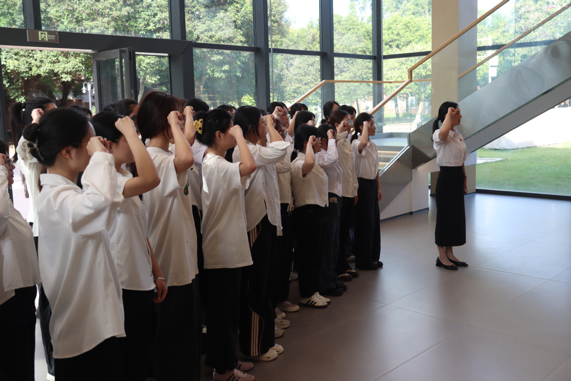 参观结束后,师生党员们整齐列队,面向鲜红的党旗庄严宣誓。铿锵有力的誓言展现了新时代青年党员对党的忠诚与承诺,也传递出他们勇担使命、矢志奋斗的决心。2022级学生党员赖晓芬表示:“宣誓不仅是一次仪式,更是一份镌刻于心的信仰承诺。我们将以行动践行誓言,在学习和实践中发挥先锋模范作用。”