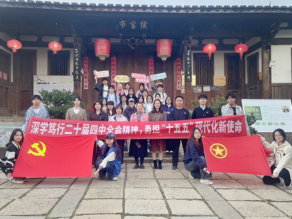 2025年11月29日,福建师范大学协和学院外语系2023级学生第二党支部与2023级日语第一团支部党团联动,共赴福州市闽侯县侯官村,开展“深学笃行党的二十届四中全会精神,勇担‘十五五’现代化新使命”主题党日活动。教工党员谢淑媛、刘丹同行指导。