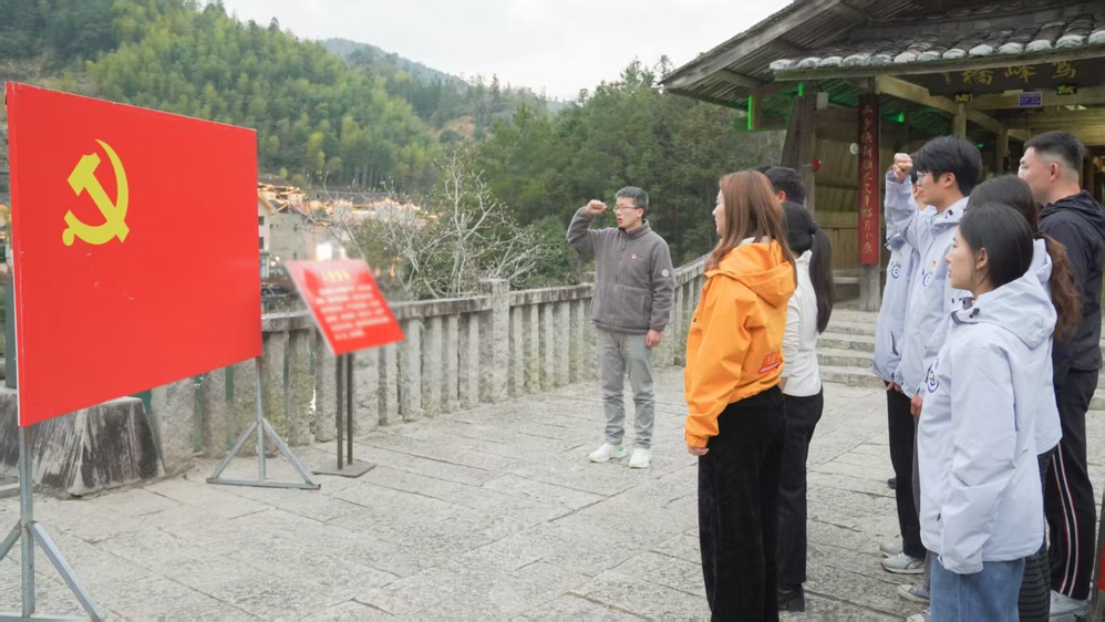 1月18日,信息技术系党总支“旗帜知行”实践队师生党员代表,在宁德市寿宁县下党乡鸾峰桥重温入党誓词。