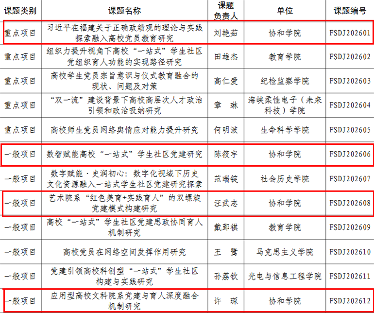 近日,福建师范大学党委组织部公布2026年度校级党建研究课题立项名单。福建师范大学协和学院共有4项课题获批立项,其中重点项目1项,一般项目3项。获批立项数量创历年新高。