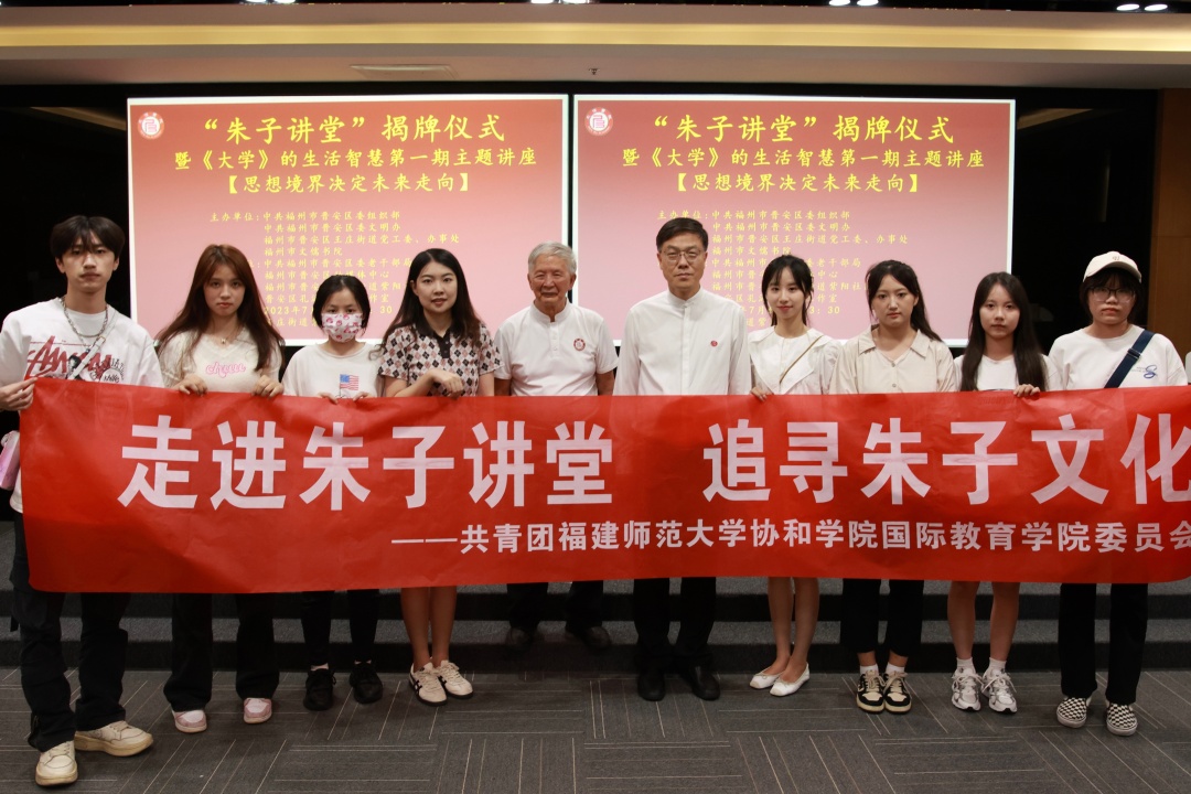 为弘扬朱子文化,讲好中国故事,坚定文化自信,7月6日下午,福建师范大学协和学院国际教育学院团委负责人徐靖怡,辅导员陈舒宁及学生代表前往晋安区王庄街道紫阳社区参加“朱子讲堂”正式揭牌设堂讲学活动。本次活动由晋安区委组织部、文明办,王庄街道党工委、办事处和福州市文儒书院共同主办,晋安区委老干部局、晋安区融媒体中心、王庄街道紫阳社区和晋安区孔海钦党建工作室承办。