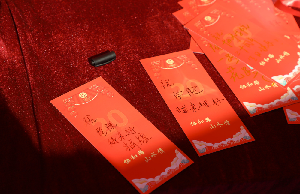 校友签到处校友们齐聚一堂,重走当年求学之路,追忆当年青葱岁月。校友与在校生们纷纷写下对学校生日的美好祝福,大家在信笺上一字一句,吐露出对母校的真挚情感,通过小小红绳悬挂款款恩情。