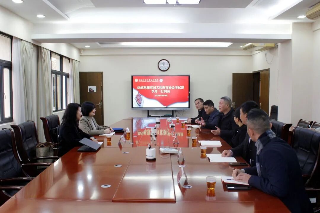 12月20日上午,英国文化教育协会考试部华南区副总监李丹、华南区考点经理祖双双受邀来访我院,洽谈雅思考试战略合作事宜。福建师范大学协和学院党委常务副书记陈林男、院长杨林香、副院长卢宇一行热情接见了协会代表,并出席会议,参加此次会议的还有网络信息与实验管理中心、国际教育学院及国际事务部相关人员。