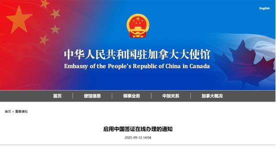 9月12日,中国驻加拿大大使馆发布启用中国签证在线办理的通知。