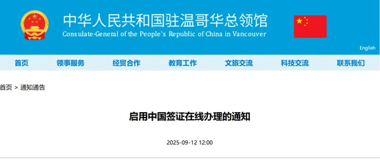 同天,中国驻温哥华总领馆也发布启动中国签证在线办理的通知。