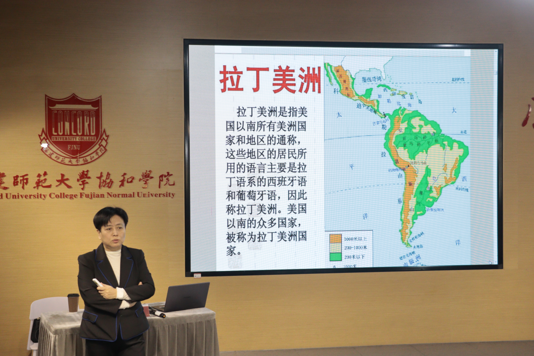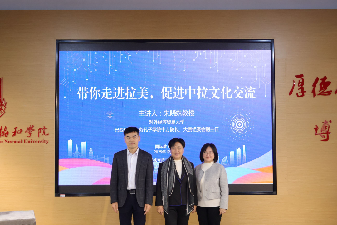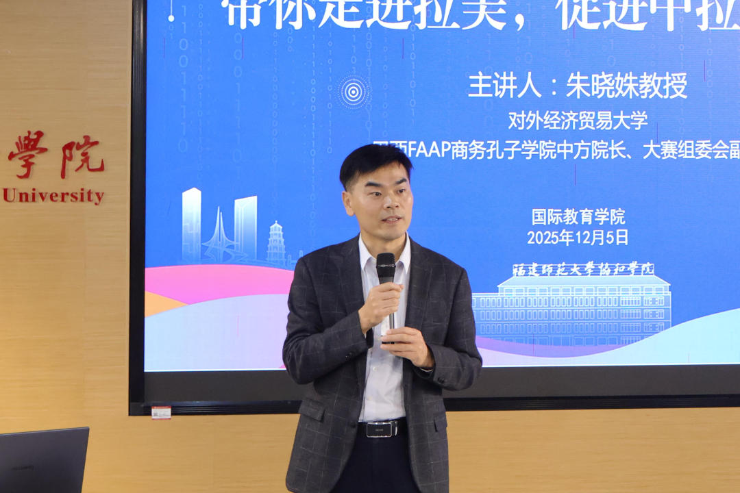 为拓展学生国际视野,深化跨文化理解,推动高素质国际化人才培养,12月5日下午,福建师范大学协和学院国际教育学院于创和园举办“带你走进拉美,促进中拉文化交流”主题讲座。本次讲座特邀2025“协和杯”世界大学生人工智能+国际商务谈判大赛组委会副主任、对外经济贸易大学英语教授、巴西FAAP商务孔子学院中方院长朱晓姝教授担任主讲,国际教育学院院长刘京华主持,吸引了众多学生踊跃参与。