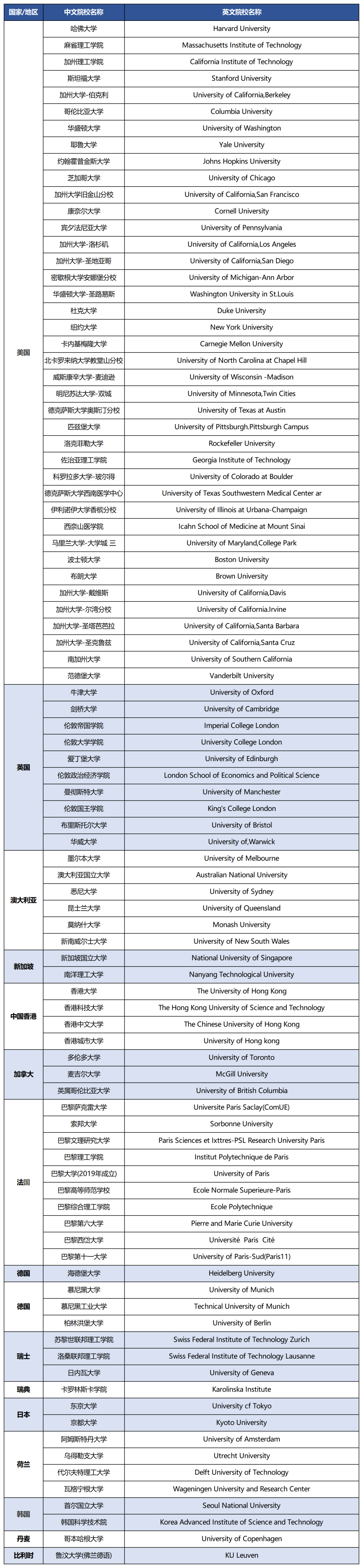 世界排名前50院校认定名单