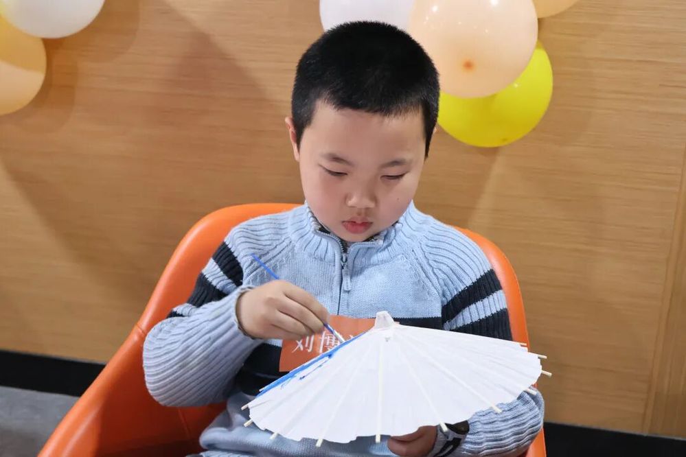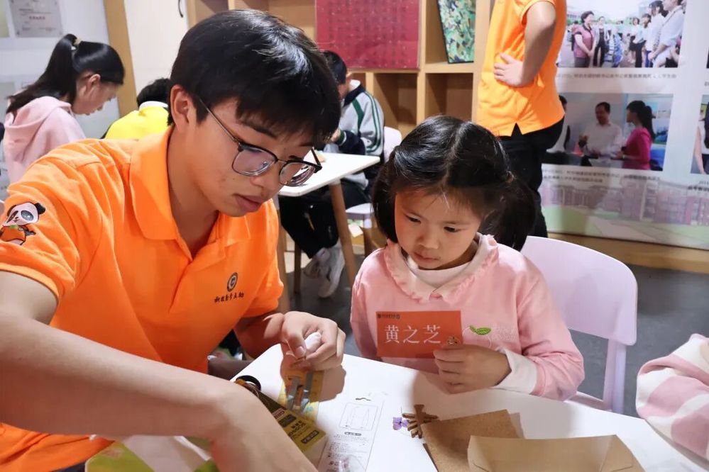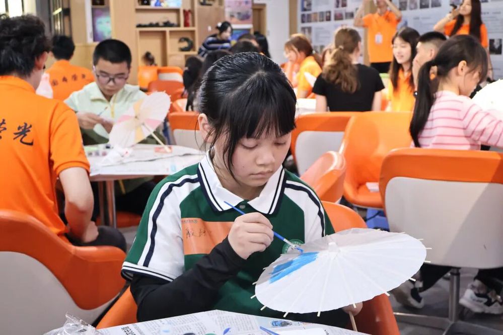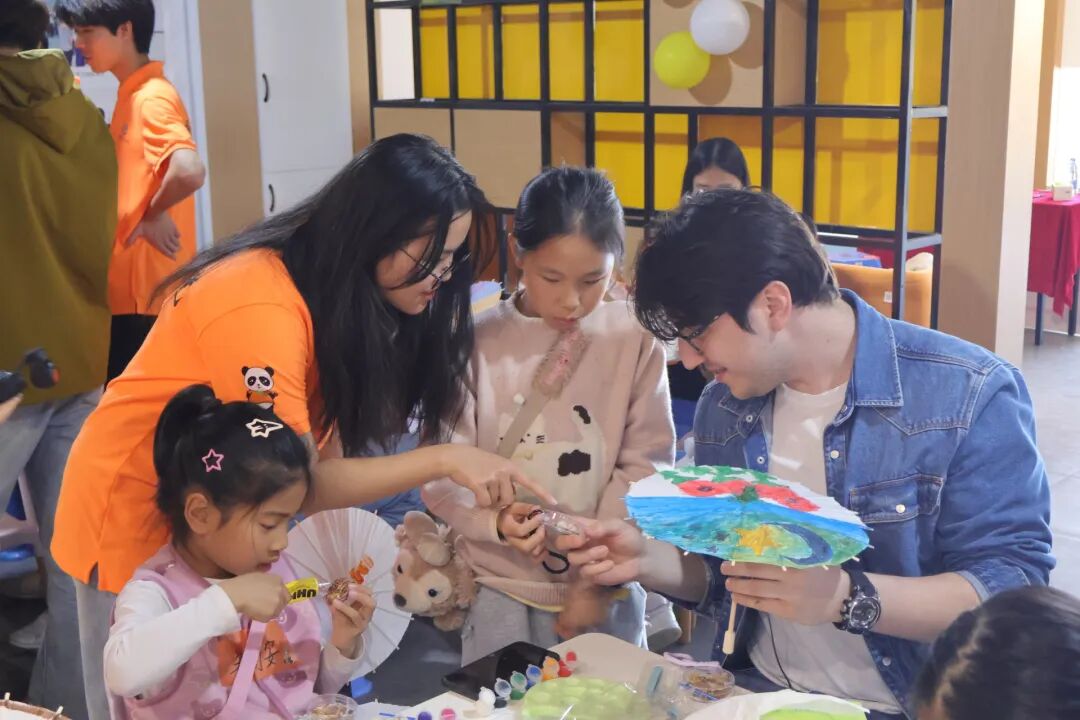 活动创新采用“大学生+小学生+留学生”混编分组模式开展软木画钥匙扣制作、油纸伞彩绘实践。国际教育学院的大学生志愿者兼顾文化引导与语言辅助,带领小学生用英语向留学生介绍非遗设计思路、讲述工艺背后的文化故事,打破学段与国籍壁垒,实现动手实践、语言表达、文化传播同步推进。