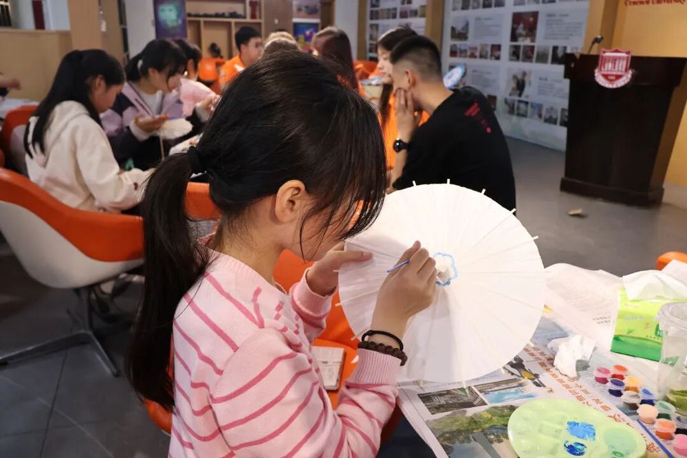 本次活动深度融合非遗文化传承、英语语用实践与跨文化交流。现场非遗讲解员双语解读闽都非遗的工艺特色与文化内涵,工作人员有序分发软木片、空白油纸伞等手工材料后,志愿者以双语详细讲解手工制作步骤,同步教学非遗相关英语单词的发音与用法,让英语学习与非遗实践紧密结合。