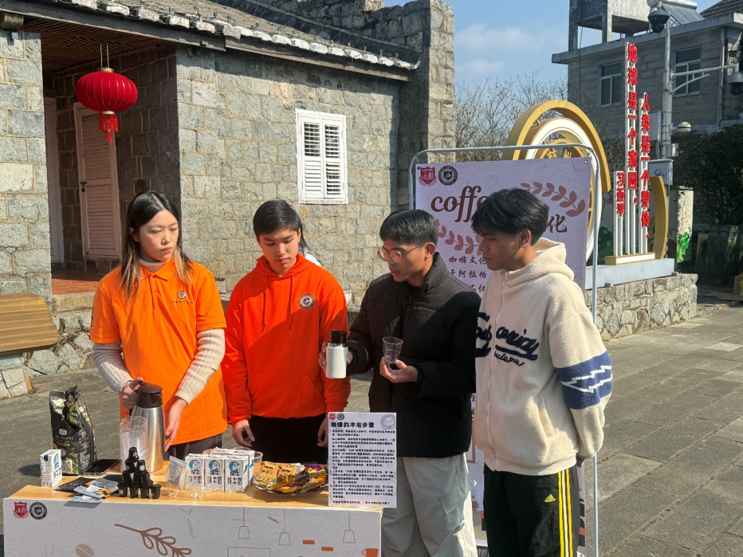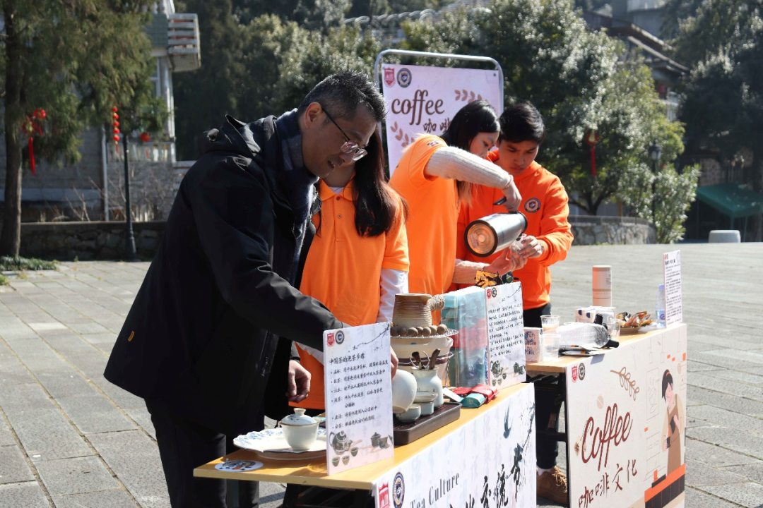 福建师范大学海外教育学院的留学生介绍并演示制作咖啡的流程