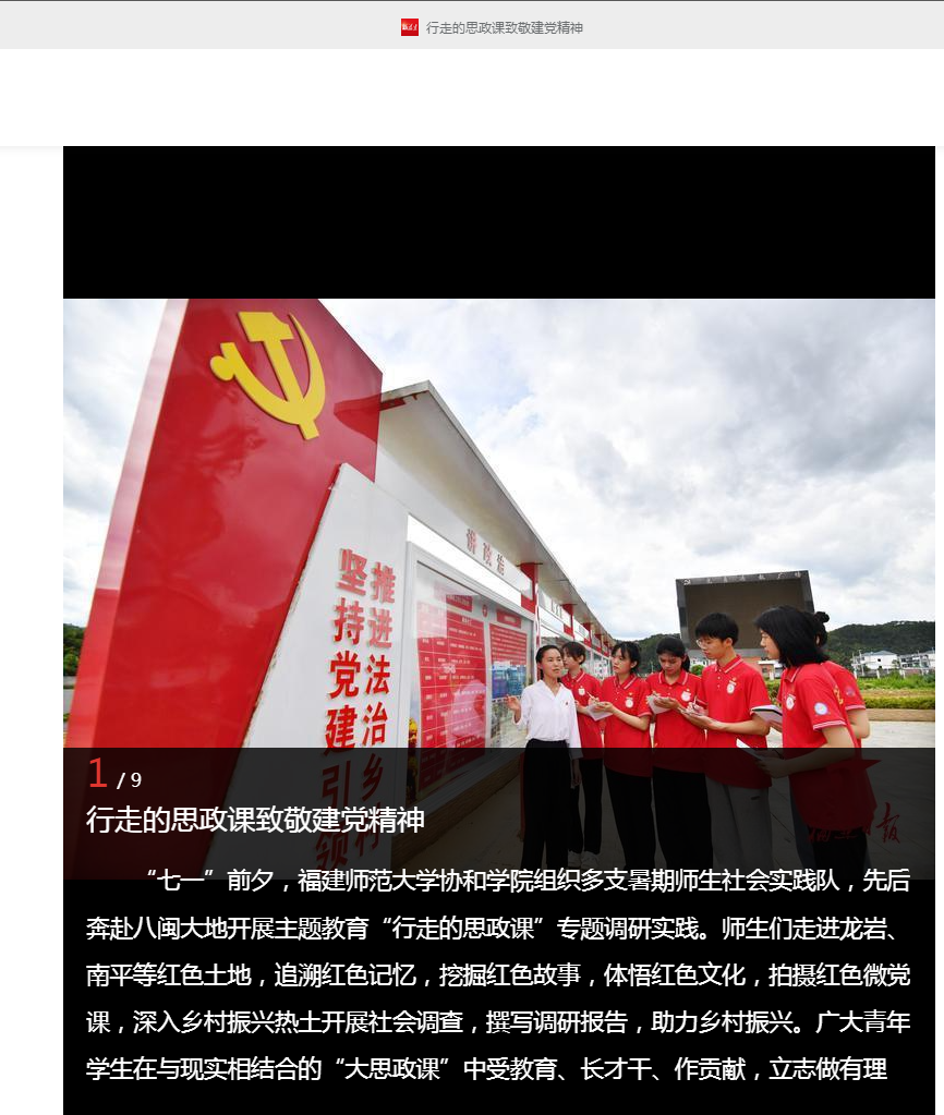 “七一”前夕,福建师范大学协和学院组织多支暑期师生社会实践队,先后奔赴八闽大地开展主题教育“行走的思政课”专题调研实践。师生们走进龙岩、南平等红色土地,追溯红色记忆,挖掘红色故事,体悟红色文化,拍摄红色微党课,深入乡村振兴热土开展社会调查,撰写调研报告,助力乡村振兴。广大青年学生在与现实相结合的“大思政课”中受教育、长才干、作贡献,立志做有理想、敢担当、能吃苦、肯奋斗的新时代好青年。