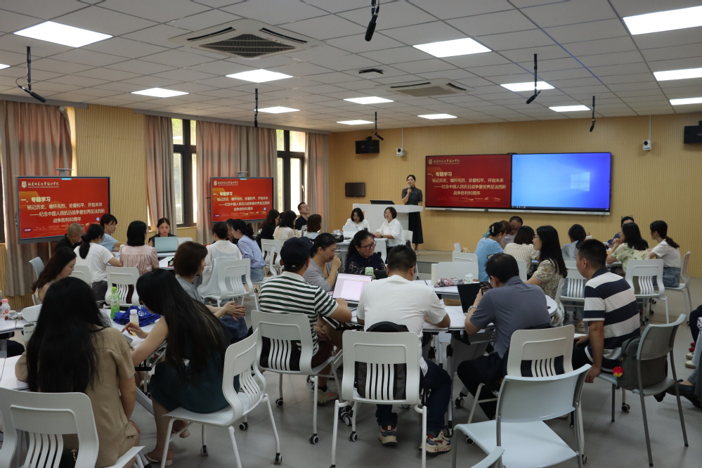 会议首先进行“纪念中国人民抗日战争暨世界反法西斯战争胜利80周年”专题学习,苏秋红书记深刻阐述了中国人民抗日战争在世界反法西斯战争中的重要地位和巨大贡献,以及这场伟大胜利所蕴含的深远历史意义和时代价值。她表示,作为教育工作者,我们更应从中汲取强大的精神力量,将爱国主义教育深度融入育人全过程,引导青年学生深刻认识历史、传承和弘扬伟大的抗战精神,坚定理想信念,锤炼过硬本领,为实现中华民族的伟大复兴贡献智慧和力量。
