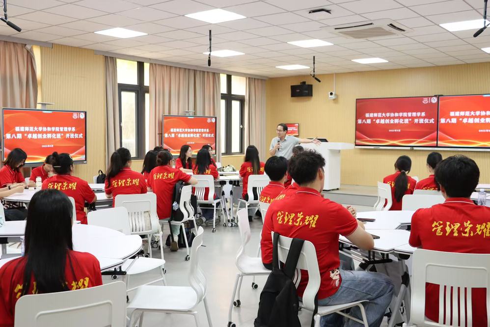 9月10日,我系第八期“卓越创业孵化班”开班仪式在学院教学楼A1-201智慧教室顺利举行。数字平原(福建)科技有限公司总经理威宏、福州氧气科技有限公司总经理杨董宝、我系党总支书记苏秋红、系主任雷金英、孵化班导师陈言国、辅导员陈宜胜以及第八期孵化班的20余名学员共同参加本次开班仪式。