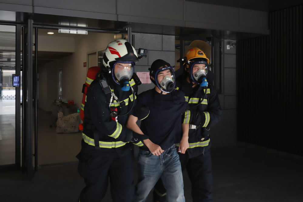 演练于当天上午正式启动。随着模拟烟雾升起和应急警报拉响,同学们迅速反应,用湿毛巾捂住口鼻、弯腰低姿,在引导员的指挥下,严格沿预定疏散路线快速、有序撤离,最终全部安全抵达荷苑6号与7号宿舍楼前的空旷区域集结。在模拟人员被困环节,两名消防员迅速展开搜救行动,动作敏捷、技术娴熟,高效完成救援任务,展现出专业的应急处置与团队协作能力,进一步强化了演练的实战性和教育意义。