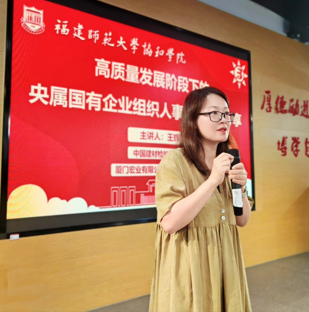为积极响应数字经济发展对复合型人才的迫切需求,助力学子在就业市场中抢占先机,9月26日,我系于学院创和园举办数智化就业服务微专业师生见面会,同时开展《人力资源管理前沿知识分享》主题讲座。中国建材检验认证集团厦门宏业有限公司企业管理部王辉部长受邀担任分享嘉宾,我系主任雷金英、副主任李莉、人力资源管理教研室全体教师,伯乐计划及微专业成员共同参加此次活动。