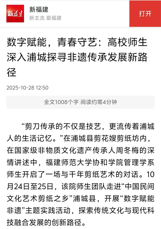 10月28日,新福建图文报道我系师生团队走进“中国民间文化艺术剪纸之乡”浦城县,开展“数字赋能非遗”主题实践活动,探索传统文化与现代科技融合发展的创新路径。