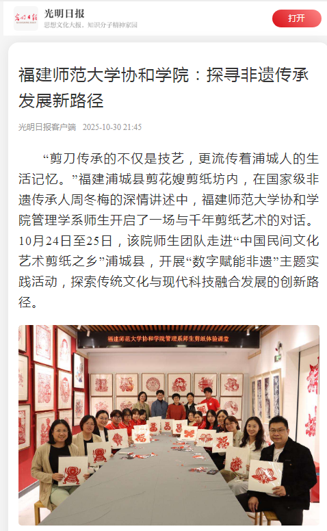 10月30日,光明日报图文报道我系师生走进“中国民间文化艺术剪纸之乡”浦城县,开展“数字赋能非遗”主题实践活动,探索传统文化与现代科技融合发展的创新路径。