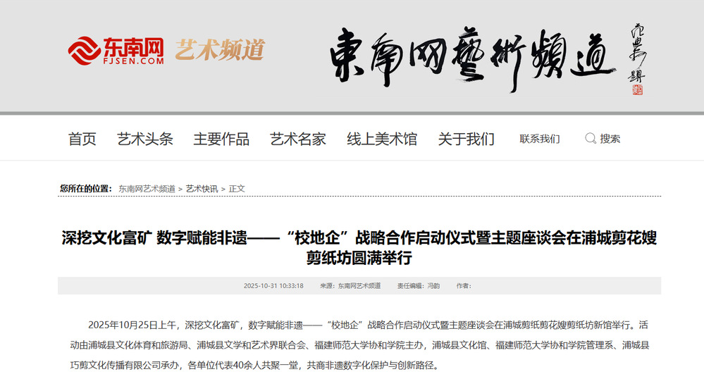 10月31日,东南网艺术频道图文报道我系师生走进“中国民间文化艺术剪纸之乡”浦城县,开展“数字赋能非遗”主题实践活动,探索传统文化与现代科技融合发展的创新路径。