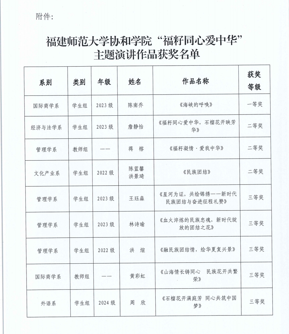 3-5月期间,我系成功举办了“福籽同心爱中华”主题演讲活动。活动中,各年级学生踊跃参与,演讲内容丰富多彩。既有同学讲述少数民族英雄雷钦、兰庭辉的革命事迹,追忆他们为民族解放浴血奋战的荣光;也有同学聚焦当下,阐述各族人民在科技研发、基础设施建设等领域团结拼搏取得的辉煌成就,生动展现各族人民团结奋斗、共筑梦想的时代画卷,通过该演讲活动,成功营造了“中华民族一家亲”的浓厚氛围,使学生深刻理解了民族团结的历史脉络与时代价值。经层层评选,最终推荐四部优秀演讲视频参加学院评审,最终获得教师组二等奖1项,学生组三等奖三项。