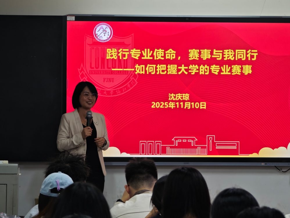 活动伊始,沈庆琼副教授做了《践行专业使命,赛事与我同行——如何把握大学的专业赛事》主题分享,她结合带队参赛实际围绕竞赛价值与意义、竞赛类别与级别、参赛流程与规则解读、备赛指导与经验分享五个方面为在场学生进行了深入讲解。