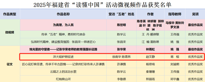 近日,福建省高校参加教育部关工委2025年“读懂中国——弘扬时代精神,建设教育强国”活动入选作品获奖名单公布。由我系2024级学子赵文静、徐南华、陈青林共同完成的征文作品《淬火熔炉照征途》,在蒋榕老师的指导下,获评优秀作品奖。