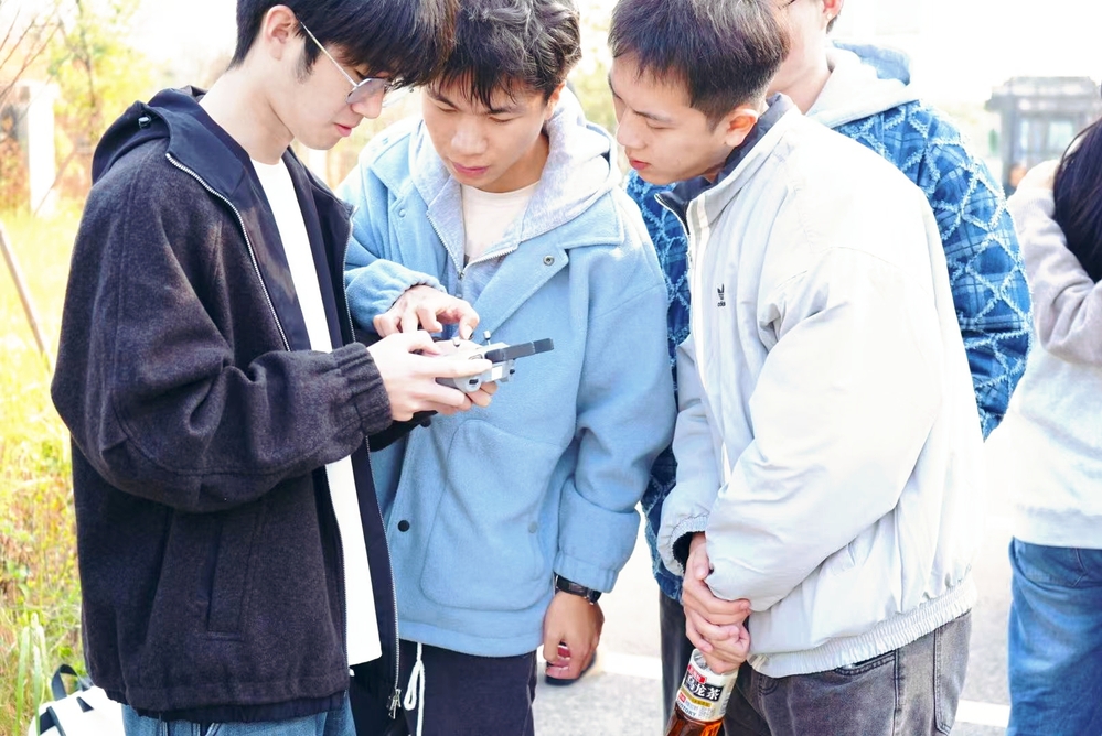 随后,支部成员移步室外开展实践操作,在江惠国、余印来老师的指导下学习无人机飞行技巧与航拍构图技能。大家以高空视角俯瞰小镇园区及周边生态景观,结合校园绿色管理调研成果,现场探讨无人机在环境巡检、资源优化配置等领域的应用前景。