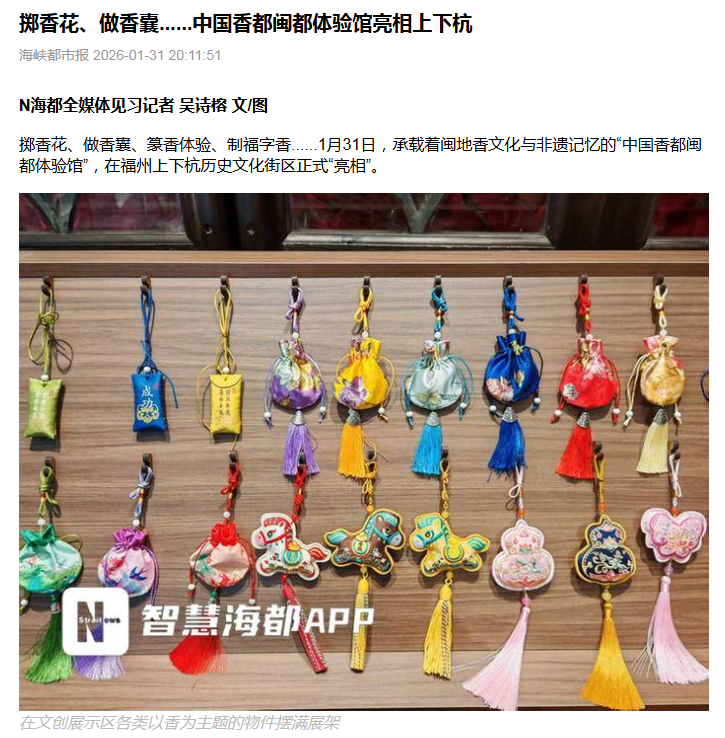 2026年1月31日,海峡都市图文报道我系与“中国香都闽都体验馆”签约合作,并揭牌 “非遗文化教育实践基地”。
