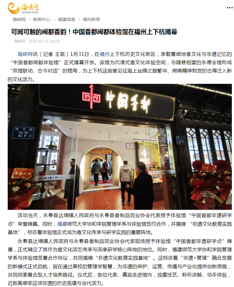 2月2日,海峡网图文报道我系与“中国香都闽都体验馆”签约合作,并揭牌 “非遗文化教育实践基地”。