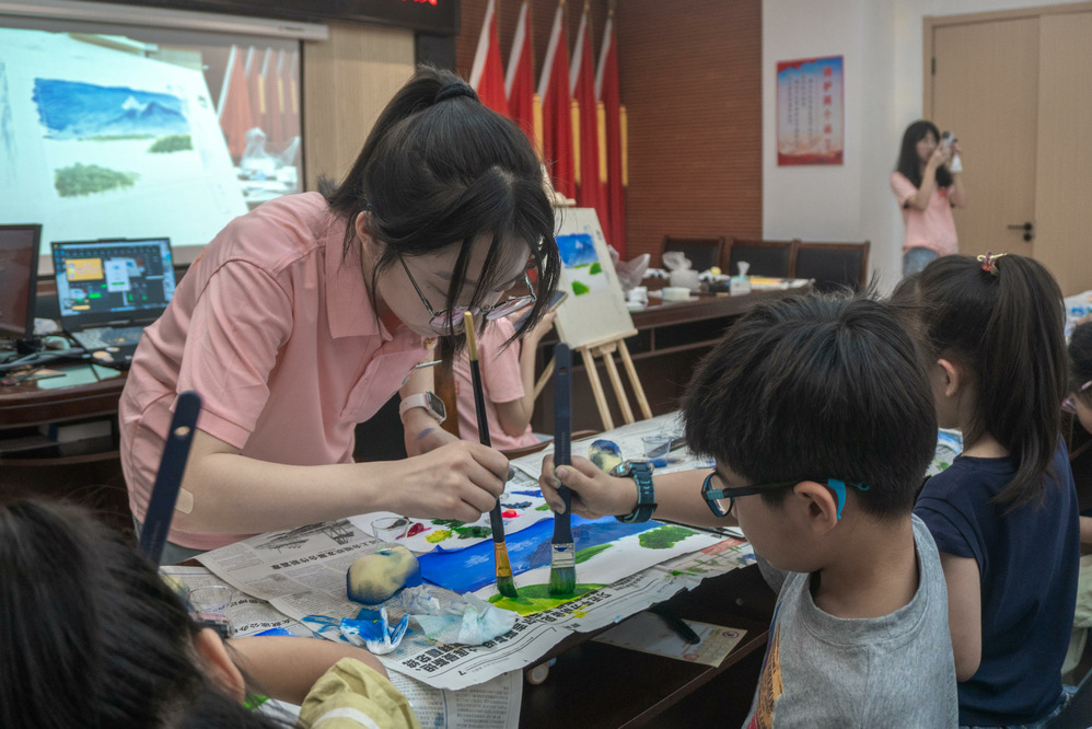 刀刃刮抹画纸的沙沙声,奏响传统与现代的交响。孩子们领略山水画的雄浑与二次元刀笔的创新活力。“smear and scrape”等技法化作指尖魔法,青山绿水在画布惊艳复苏——浮云出岫的青蓝、草叶摇曳的翠碧,不仅是画卷,更是少年用当代审美激活古老文化密码的鲜活实践。