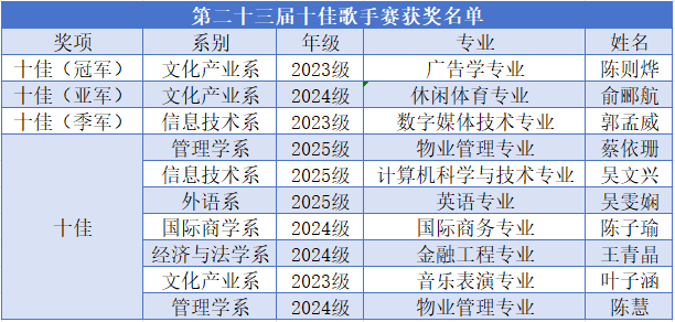 附件:第二十三届十佳歌手赛获奖名单: