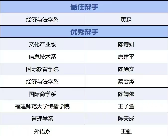 10月26日下午,辩理明晰展风采,论道深邃见真知”福建师范大学协和学院2025年新生辩论赛学术报告厅举办。福建师范大学辩论队教练陈志福建新世通律师事务所专职律师粱嘉怡福建师范大学往届辩论队队长王浩名、何浩然、罗圣开担任评委经过激烈角逐,最终经济与法学系荣获冠军,文化产业和信息技术系分别获亚、季军,经济与法学系2025级法学专业黄森获“最佳辩手”,现场还评出8名优秀辩手”。