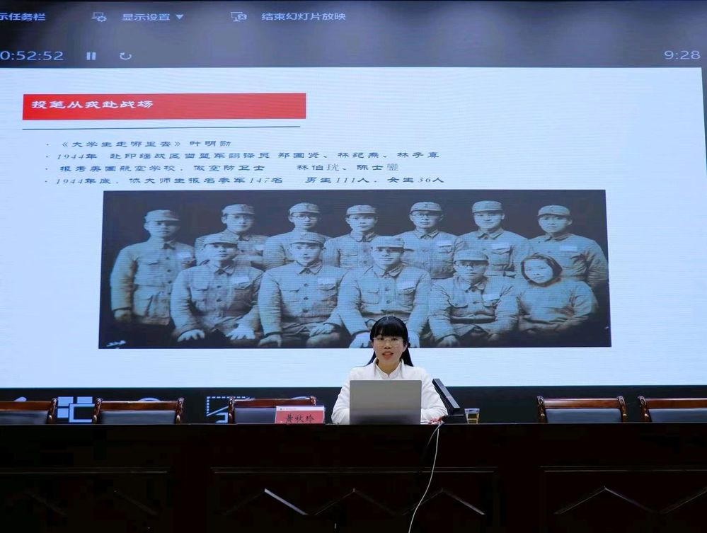 黄秋玲老师通过珍贵档案、历史影像,生动还原了福建协和大学办学历程与烽火岁月中的师生群像,展现了协大师生在中国共产党的领导下,谱写了投身民族救亡、追求光明进步的爱国史诗。从五四运动的声援,再到抗日战争的烽火,协和大学师生始终站在时代前列。在长期的革命斗争中,共有12位已知的英烈献出了宝贵的生命。如郑维新、李冠芳、郑维新、曾焕乾等,他们用生命诠释“读书不忘救国,救国不忘读书”的信念。协和大学先后成立3个党支部,共有60余位学生加入中国共产党,是地方革命的中坚力量。福建协和大学师生“以笔为枪、以校为营”的担当精神,投身革命的实践精神,是新时代青年理解“时代担当”的生动榜样和教材。