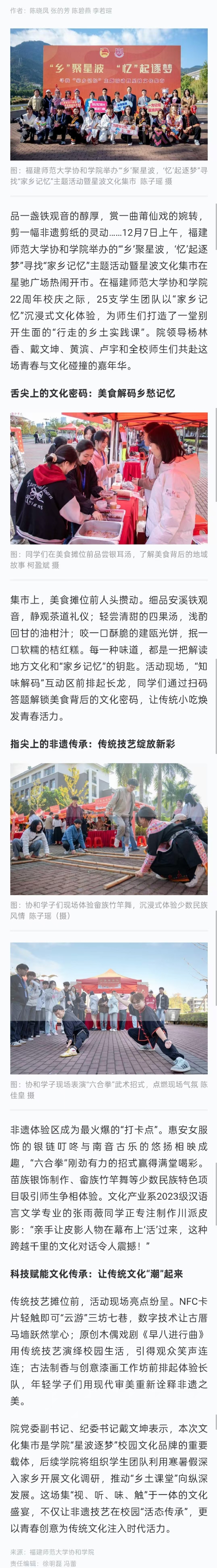 品一盏铁观音的醇厚,赏一曲莆仙戏的婉转,剪一幅非遗剪纸的灵动……12月7日上午,福建师范大学协和学院举办的“‘乡’聚星波,‘忆’起逐梦”寻找“家乡记忆”主题活动暨星波文化集市在星驰广场热闹开市。在福建师范大学协和学院22周年校庆之际,25支学生团队以“家乡记忆”沉浸式文化体验,为师生们打造了一堂别开生面的“行走的乡土实践课”。院领导杨林香、戴文坤、黄滨、卢宇和全校师生们共赴这场青春与文化碰撞的嘉年华。