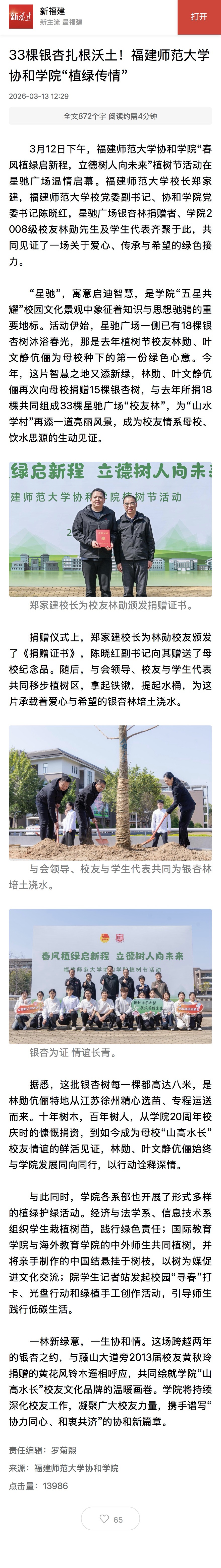 新福建报道:33棵银杏扎根沃土!福建师范大学协和学院“植绿传情”