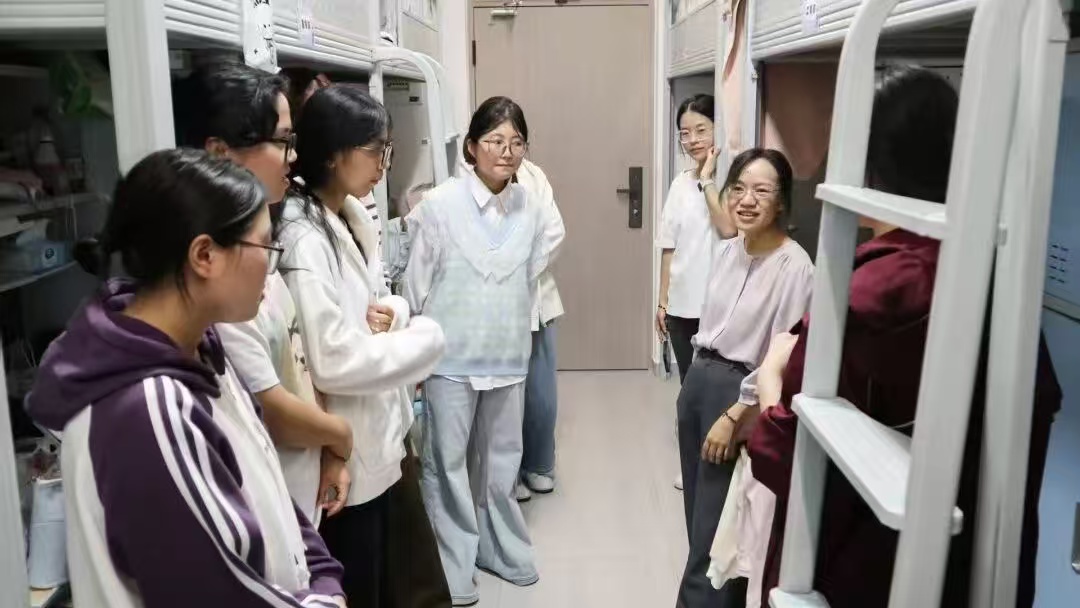 导师走访宿舍过程中,关切询问同学们在大学生活和学习中遇到的问题,积极为同学们答疑解难。导师们结合自身的学术背景和行业洞察在学习与规划方面给予同学们耐心细致的解答。一句句暖心的话语迅速拉近了师生之间的距离,让学子们充分感受到来自国际商学系大家庭的温暖。