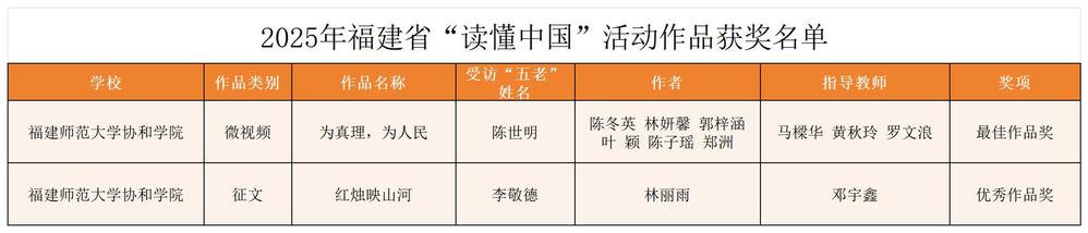 近日,福建省教育系统关工委印发《关于公布我省高校参加教育部关工委2025年“读懂中国”活动入选作品获奖名单的通知》(闽教关委〔2025〕18号)。国际商学系共获两项省级荣誉,其中由国际商学系、信息技术系共同选送的微视频《为真理,为人民》获“最佳作品奖”1项,国际商学系选送的征文《红烛映山河》获“优秀作品奖”1项。