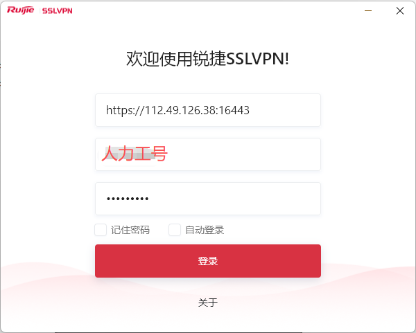 2、在弹出的客户端输入“服务地址”(https://112.49.126.38:16443)、“用户名”、 “密码” 登录。