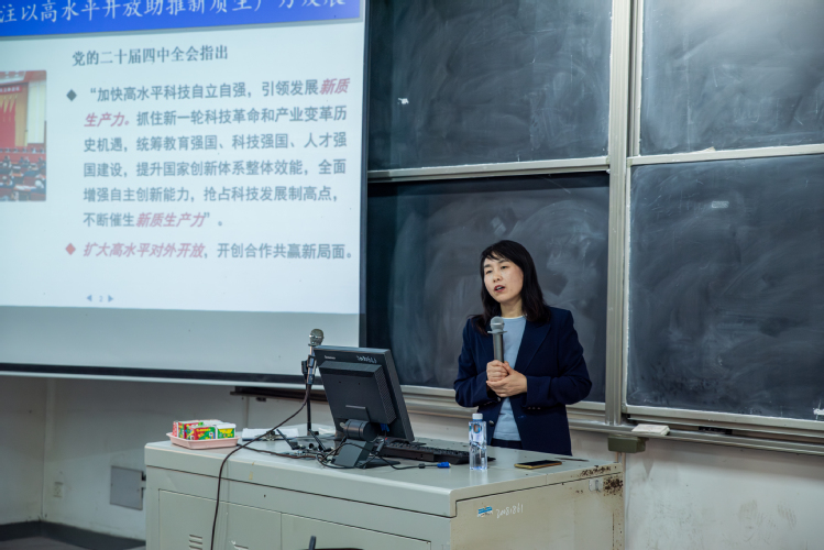 下午3时整,讲座正式开始。杨丽花教授以当前全球科技创新竞争格局为切入点,引导同学们思考在百年未有之大变局下,中国如何通过发展新质生产力抢占未来发展制高点。杨教授指出,新质生产力是以科技创新为主导、高新技术应用为特征的先进生产力形态,强调创新驱动与效率提升,华为、比亚迪、泡泡玛特等企业是其典型代表,而金融资本则为科创突破提供关键支撑。“金融专业的同学们,你们未来可能就是这些创新企业的‘助推器’。”杨教授的话语让在场同学感受到自己专业的价值与责任。