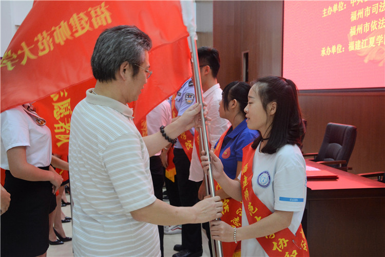 随后,由出席的省市领导为经济与法学系普法志愿者代表授旗,为“七五”普法宣讲团代表徐殿秀颁发聘书。