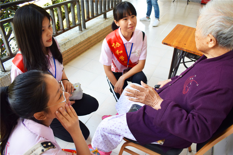 随后,同学们为老人送上了精心准备的香福袋,里面装着同学们事先写好的祝福,有些老人不识字,同学们则将祝福读给老爷人们听。