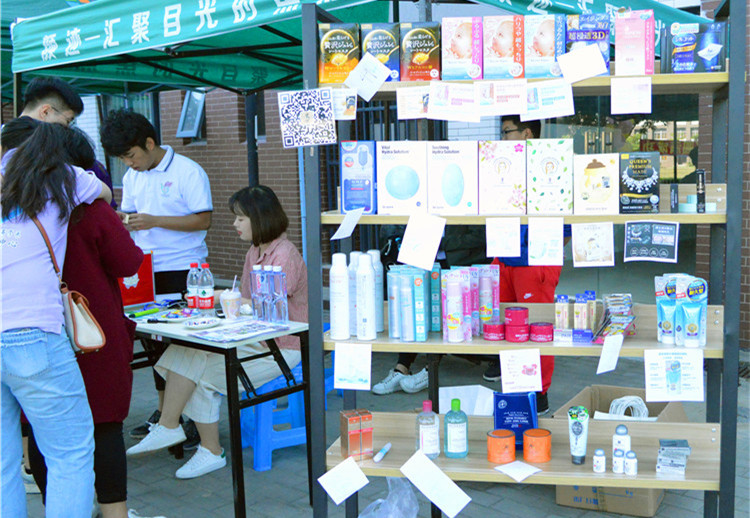 上午10点,各个摊位的商品已经有序摆放整齐,陆续经过的人们聚集到市场周边,有的还在讨论心仪的商品,有的已经摩拳擦掌,准备血拼一场。很快,木兰妆售卖摊位被顾客团团围住,面膜、补水喷雾等化妆品吸引了不少学生。“选择做化妆品这块主要是出于团队发展前景考虑,我们就读电子商务专业,善于电商交易,继而采用新媒体营销方式在线上和线下对接销售。”张圣泽一边招呼着顾客,一边解答木兰妆团队的运营方式。现场,木兰妆团队还通过直播展示各个摊点的销售情况,同时推广着自己的商品。